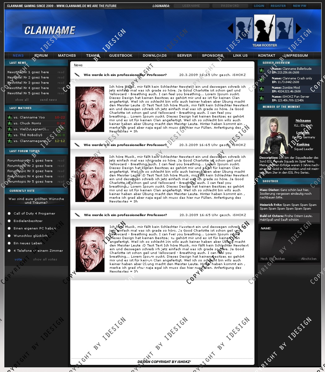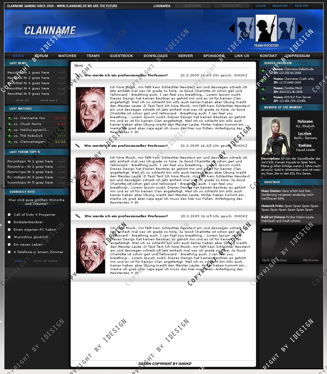 Dies ist ein professionelles Clandesign. Eine übersichtliche und geordnete psd Datei mit allen vorhandenen Ebenen ist vorhanden. Bei weiteren Fragen oder Support wenden sie sich per E-mail an "[email protected]" Dieses Design gibt es auch in blau. Schaut bei meinen Produkten