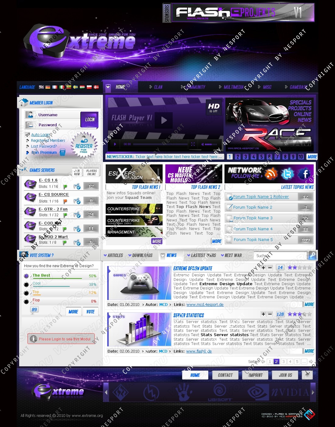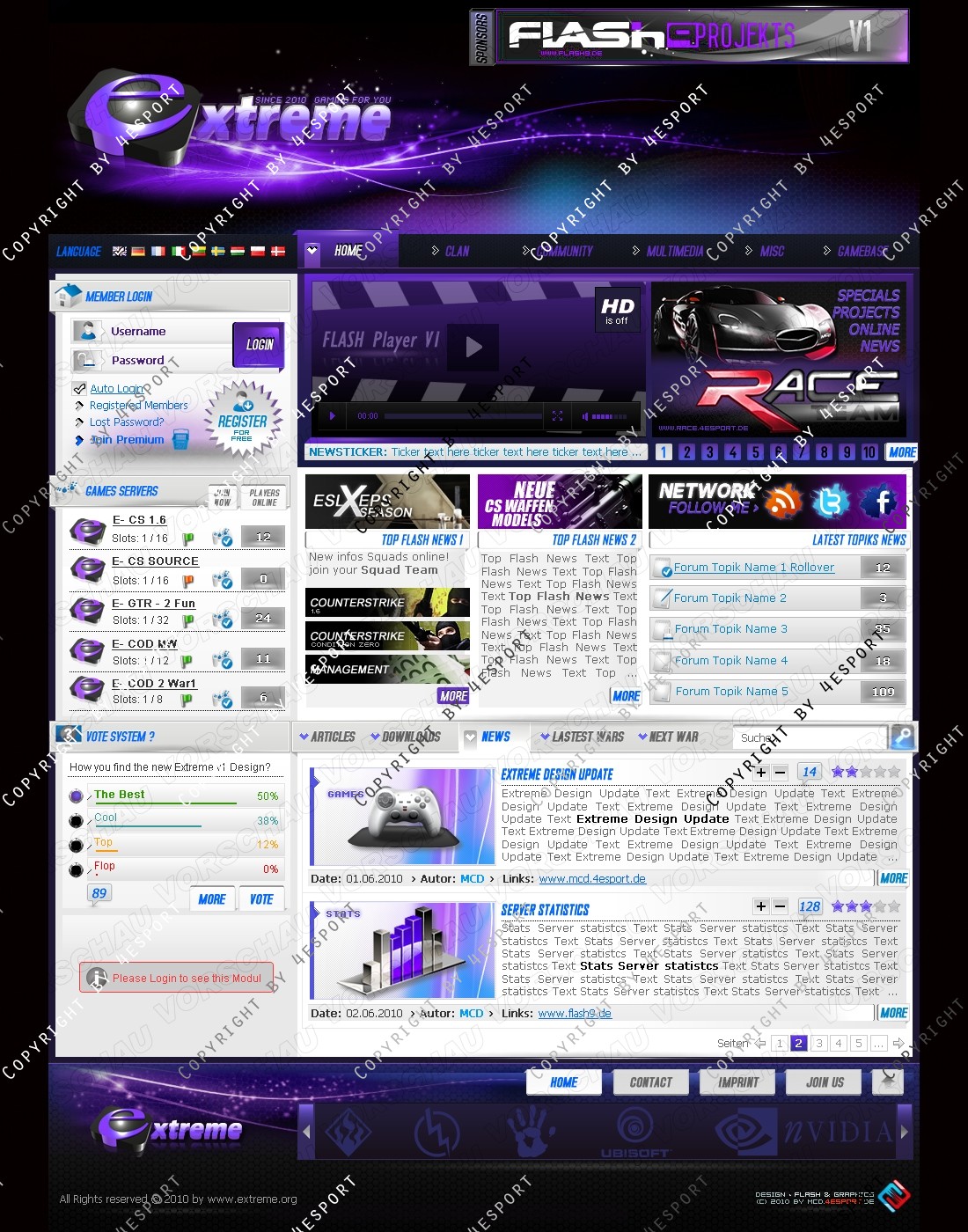 b) Rechte Seite: Top Flash News 1, Top Flash news 2, Network, Forum Topics, Tabs System: Artikels, News, Downloads, Latest Wars, Next War.
