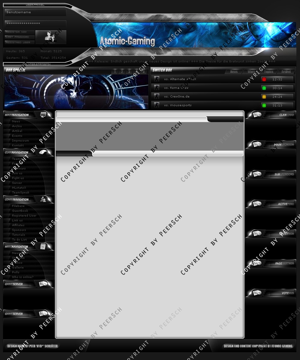 Was Sie hier kaufen ist lediglich die PSD Datei, gerne kann ich es Ihnen gegen einen Aufpreis von 13€ an ein CMS Anpassen, zur Auswahl stehen hierbei: webSPELL, Clansphere, Teklab, Devilz und andere CMS auf Anfrage ohne Aufpreis.