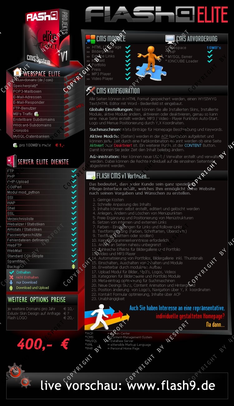 FLASH CMS V1 - Ein Content Management System, Corporate Design, Portfolio, Gallery, Mp3 Player, Video Player, Kontakt und Preiss Formular, V1 die Perfekte Flash CMS für Privat & Firmen.