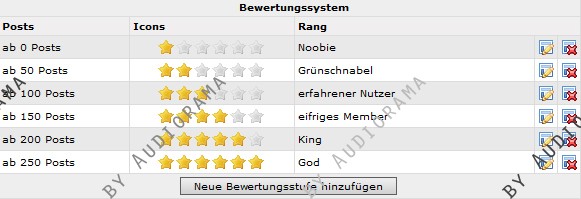 Mit diesem Mod lassen sich Ränge definieren, die ab einer bestimmten Anzahl von Forenposts erreicht werden können. Zu dem Rang selber werden eine für den Rang definierte Anzahl an Icons (hier Sterne) angezeigt, welche für einen Admin bzw. Forenmoderator auch in einer anderen Farbe dargestellt werden kann. Einstellbar ist das ganze bequem über einen neuen Eintrag im Adminmenu.