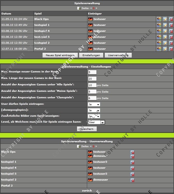 Angelehnt an das System der ESL habe ich hier eine Verwaltung für Spiele im Clan oder in der Community gecode, für die sich Member eintragen können. Zusätzlich können die Member im Clan eigene Spiele einreichen, indem sie ein Formular ausfüllen. (Dieses Feature kann aber vom Admin abgeschaltet werden)