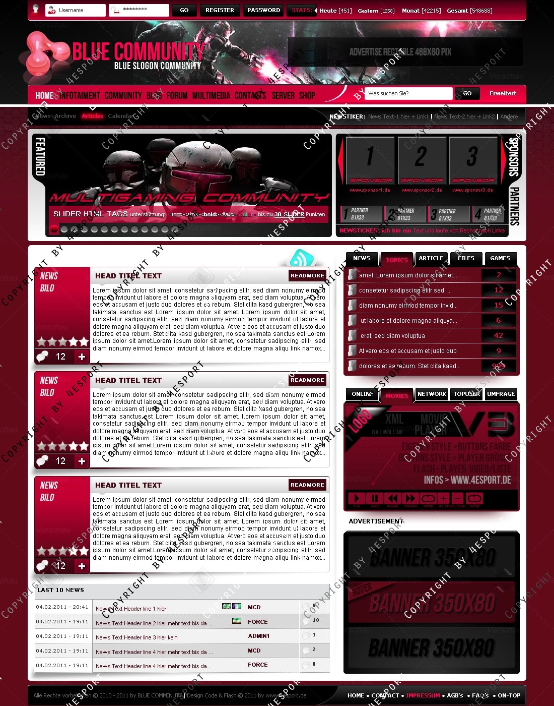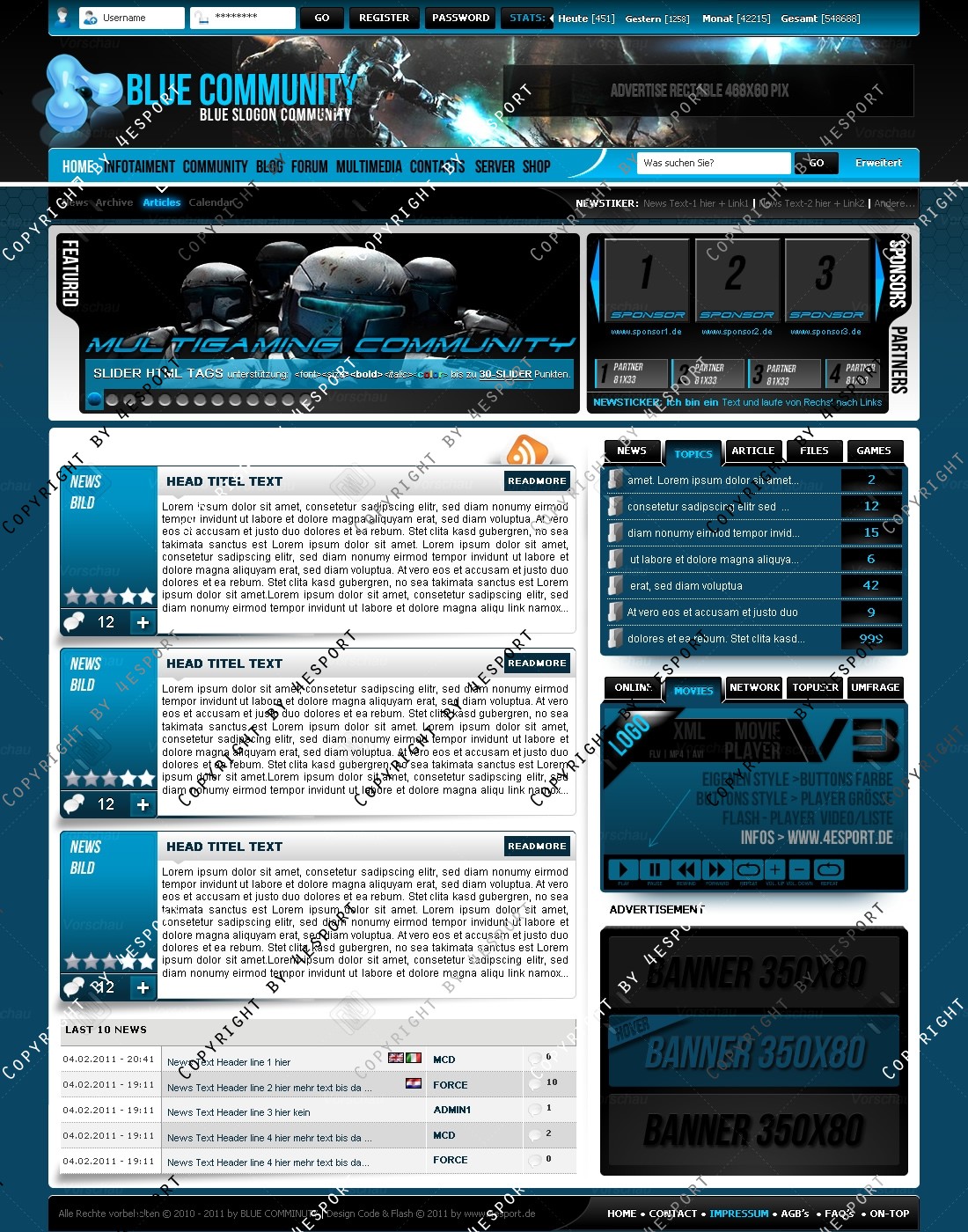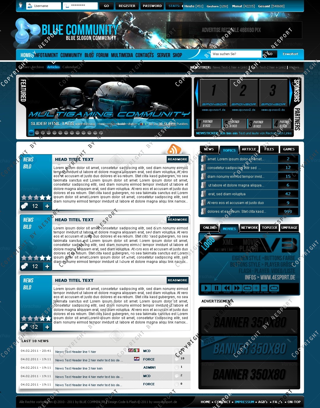 Blue Community Templates Premium edition mit Flash Player 1 V3 Custom Edition und Featured System, CMS Erweiterung Webspell 4.2.2a, wird auf wunsch auf ClanWORLD v1.1 auch gecodet.