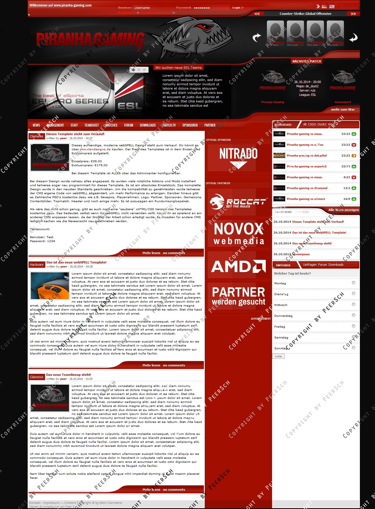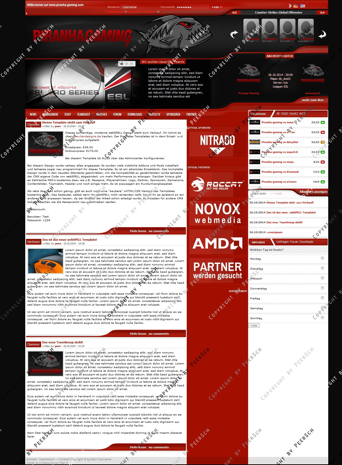 Kostenlos dazu gibt es noch folgende PSD's: Content Slider.psd, Gameicon.psd, Header.psd, Newspic.psd, Partner und Sponsoren.psd, Piranha Logo.psd, Playerrahmen.psd, Squadbanner.psd und Topmatch.psd